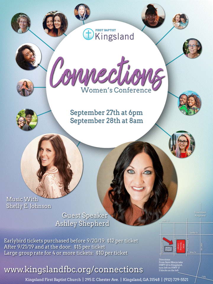 Connections Women's Conference Friday, September 27, 2019 8:00 AM 1:00 PM 08:00 13:00 Google Calendar ICS Guest Speaker: Ashley ShepherdFor tickets and information go to: www.kingslandfbc.org/connections or call 912-729-5521