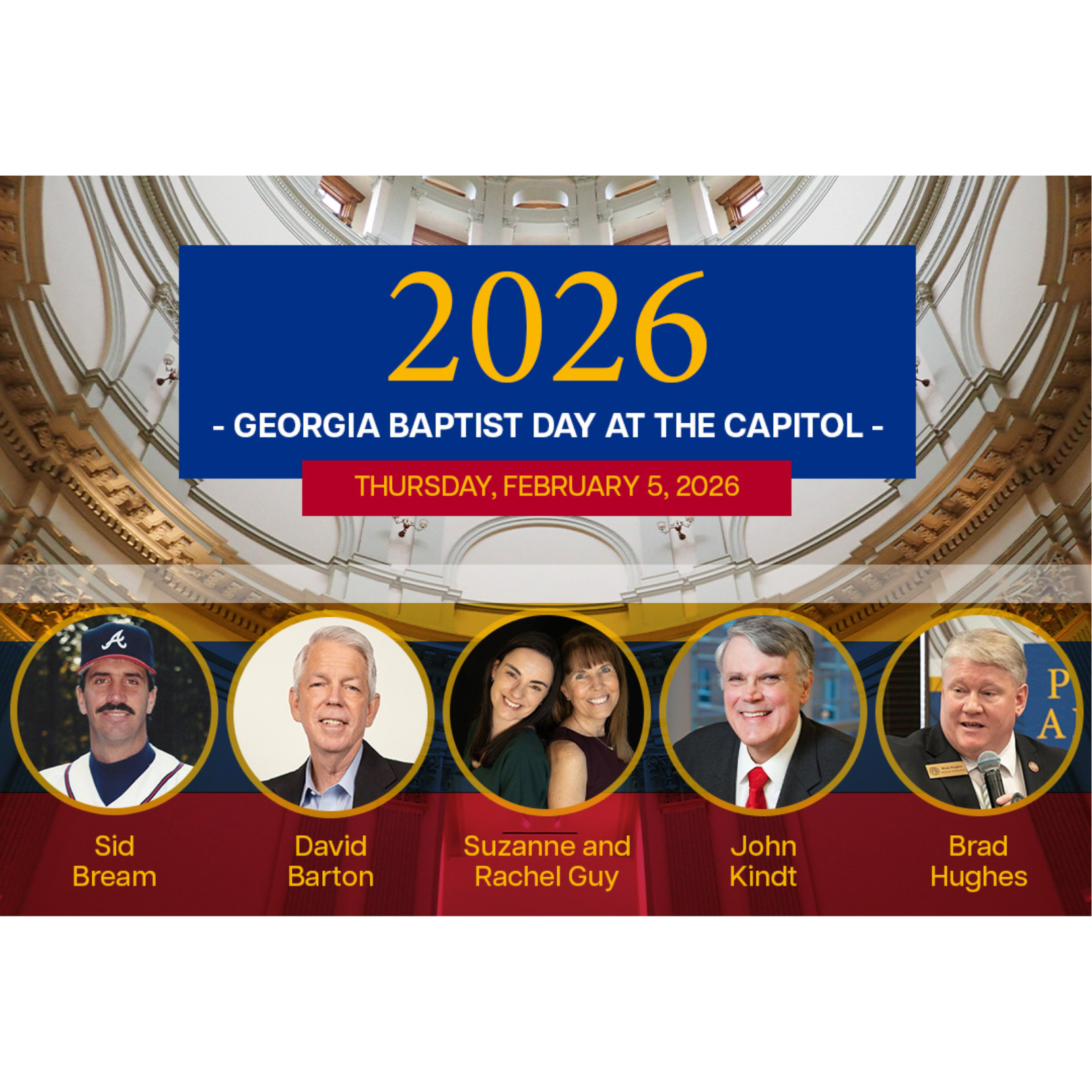 Once again, we’re combining the Legislative Prayer Breakfast into what is now named the “Annual Georgia Baptist Day at the Capitol”! We encourage you to join us at 7:30 a.m. for breakfast and 12:00 noon for lunch to hear from legislators, public policy experts and activists from across the nation. We will also participate in a tour of the State Capitol before lunch.