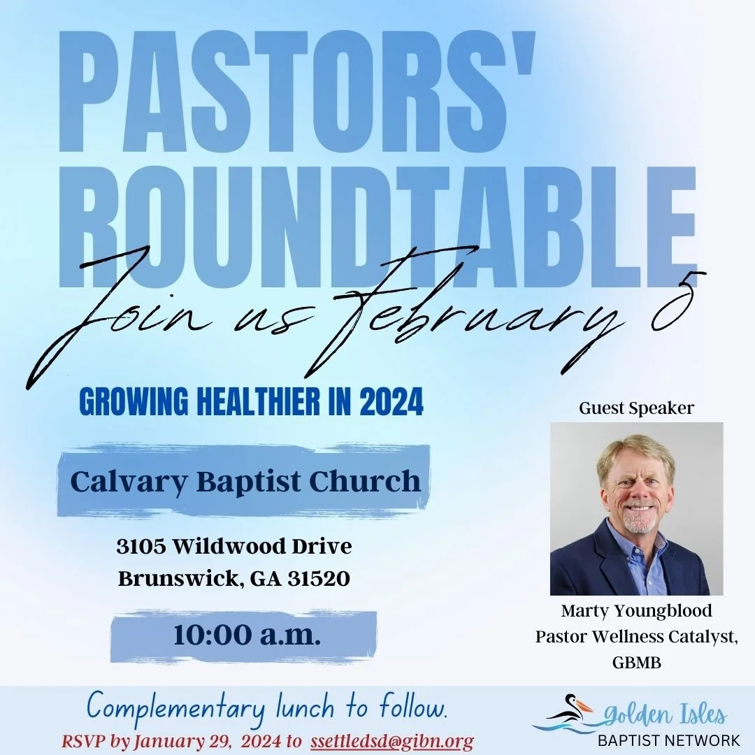 Join us on Monday, February 5 at 10 am at Calvary Baptist to discuss Growing Healthier in 2024 with guest speaker Marty Youngblood, GBMB, Pastor Wellness Catalyst. A complimentary lunch will be served following all discussions.